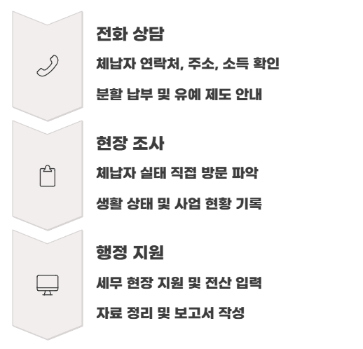 체납관리단의 주요 업무는 전화 실태 확인과 방문 실태 조사로 나뉩니다. 먼저, 전화 실태 확인은 체납자에게 직접 연락해 소득, 재산, 납부 가능 여부 등을 확인하는 업무예요. 단순히 정보만 묻는 것이 아니라, 분납 제도나 납부 유예 제도를 친절히 안내하며, 상담원 역할을 함께 수행합니다.
