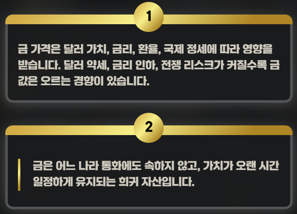 또한 금 가격은 달러 가치, 금리, 환율, 그리고 국제 정세에 따라 영향을 받아요.