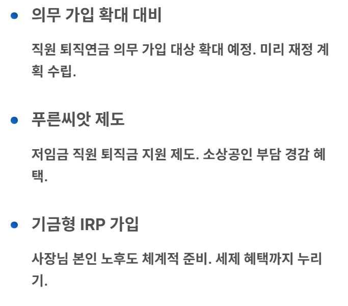 자영업자는 직원 퇴직연금 의무 가입 대상이 확대될 수 있다는 점을 미리 알아두어야 해요. 소상공인을 위한 푸른씨앗 제도를 활용하여 저임금 직원의 퇴직금을 지원받을 수도 있어요. 또한, 기금형 IRP를 통해 사장님 본인의 노후도 체계적으로 대비할 수 있답니다.